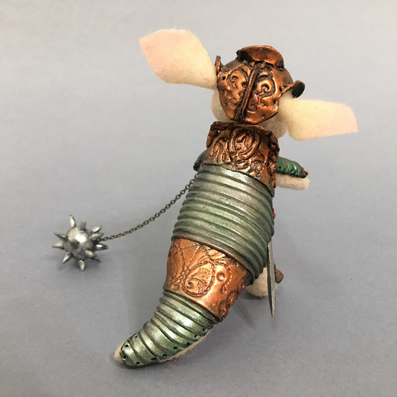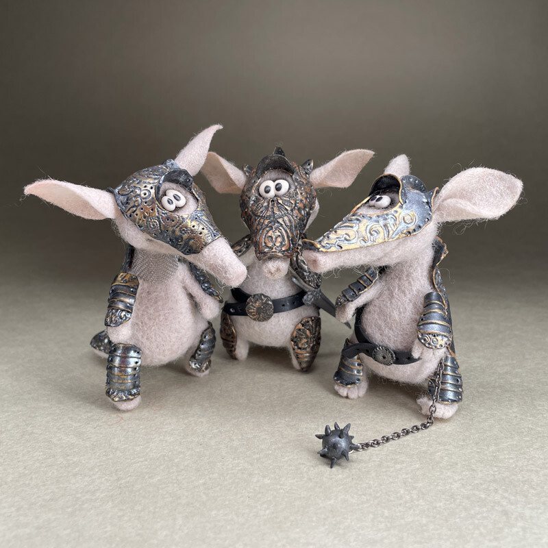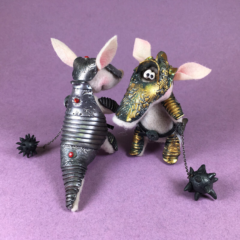 Фигурка Броненосца сделана из шерсти, а рыцарские доспехи с тонкой чеканкой и позолотой - из запекаемой полимерной глины.