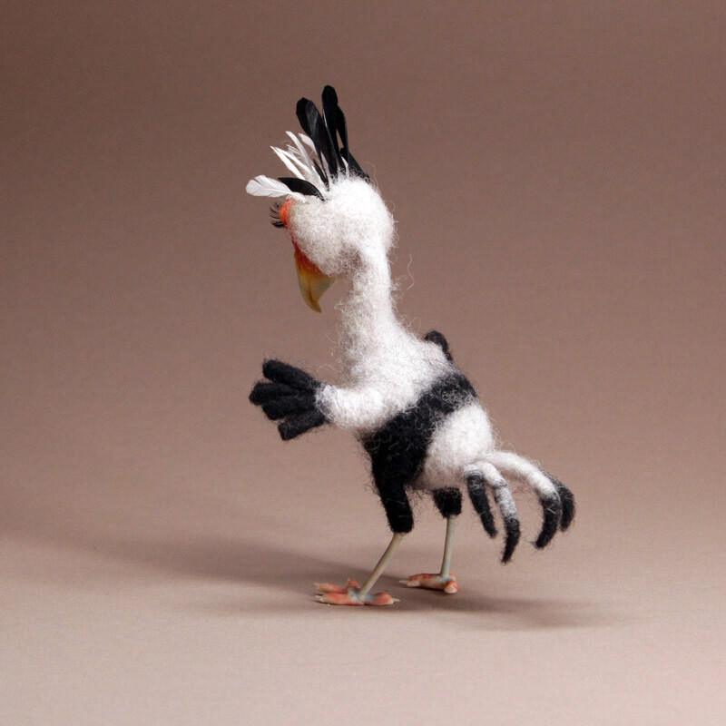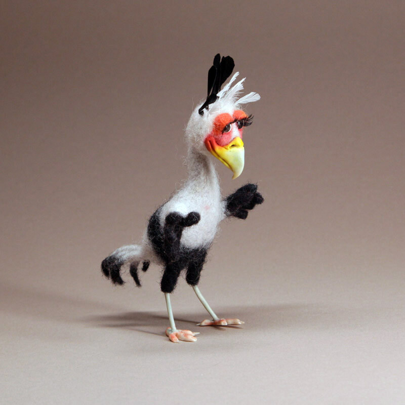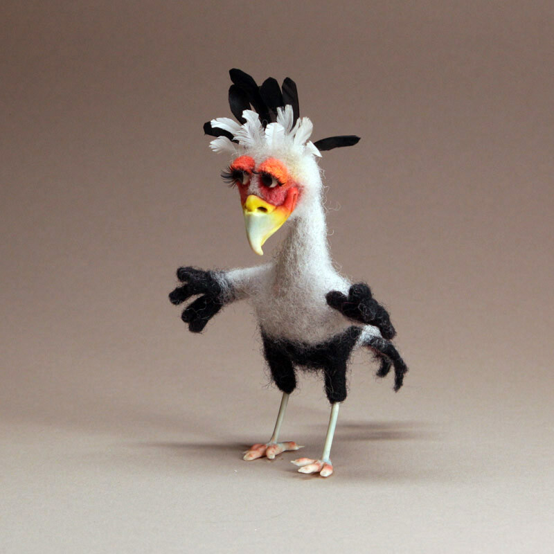 Птица-Секретарь - известная африканская охотница на змей, с мощными ногами, хищно загнутым клювом, яркой окраской "лица" и очаровательными длинными ресницами и прекрасной короной из перьев. Эти особенности навели меня на мысль превратить птицу в барышню-Секретаршу - красотку и модницу с ярким макияжем.